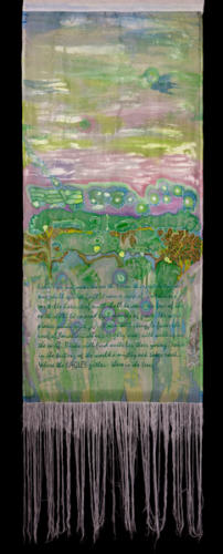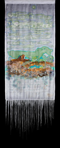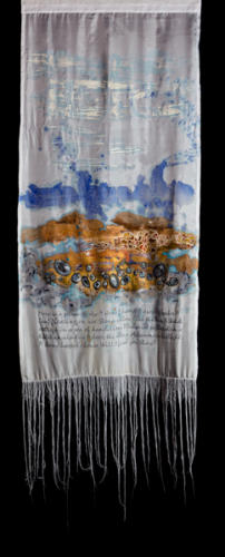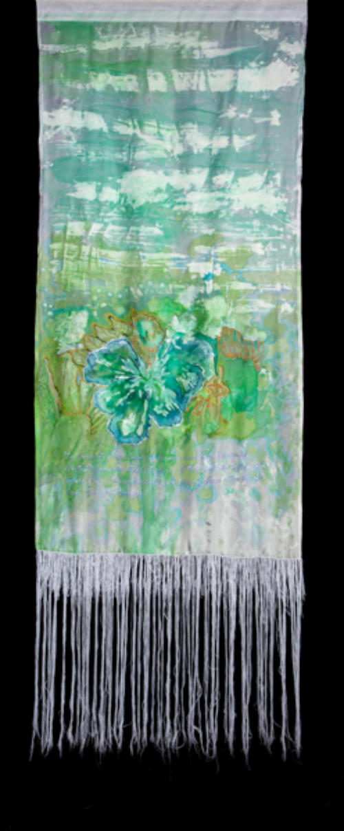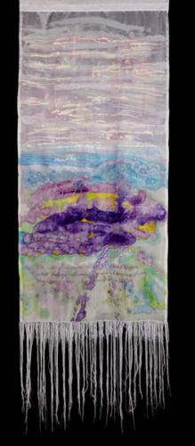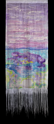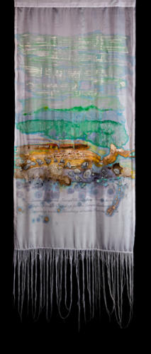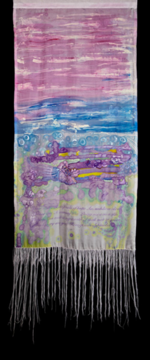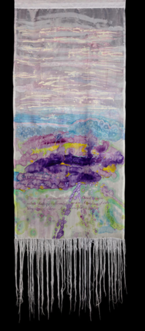 Gibson’s Public Art Gallery, Gibson’s Landing, BC ‘When Stones Speak.’ An Installation Exhibit: Acrylic In a career spanning nearly 50 years, her creative talent covers a wide variety of styles. Her art hangs in collections in Japan,Holland, Australia, New Zealand, UK, the USA, and Canada, including Vancouver and her hometown of Gibsons, BC. Pauline has been involved in the Gibsons Public Art Gallery since its eariest days. She has exhibited there often over the years, as she will again from 5th-28th April, 2014. When Stones Speak, An Installation: Acrylic Inks –Poetry on Silk. She has also shown her work both in The Sunshine Coast Arts Centre in Sechelt, and other Coast galleries. Pauline uses mainly acrylic inks, sometimes with a watercolour technique. Initially, her work was very detailed, full of whimsy and humour, in bright colours. SPEAKING SILKS An Odyssey  Dimensions 90" x 44" fringe approx .28" Medium: Acrylic inks, acrylic paint on silk with handmade cotton fringe Nine panels with poetry.
